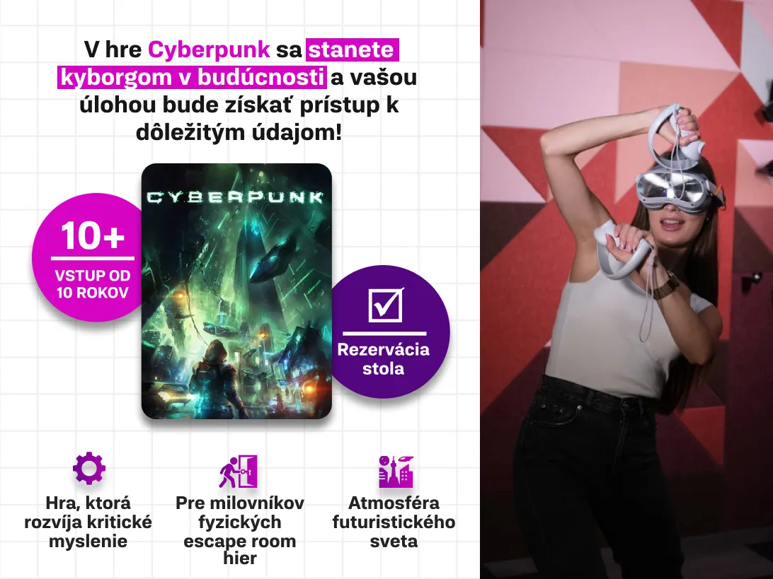Odporúčame si hru rezervovať vopred, pretože počet VR okuliarov je obmedzený.Rezervácia vám zaručí 100 % miesto a nebudete musieť čakať.